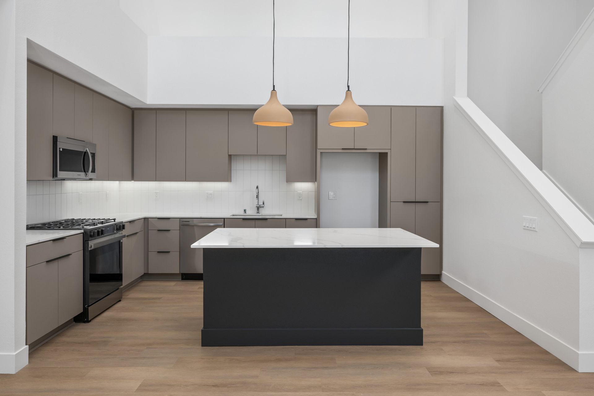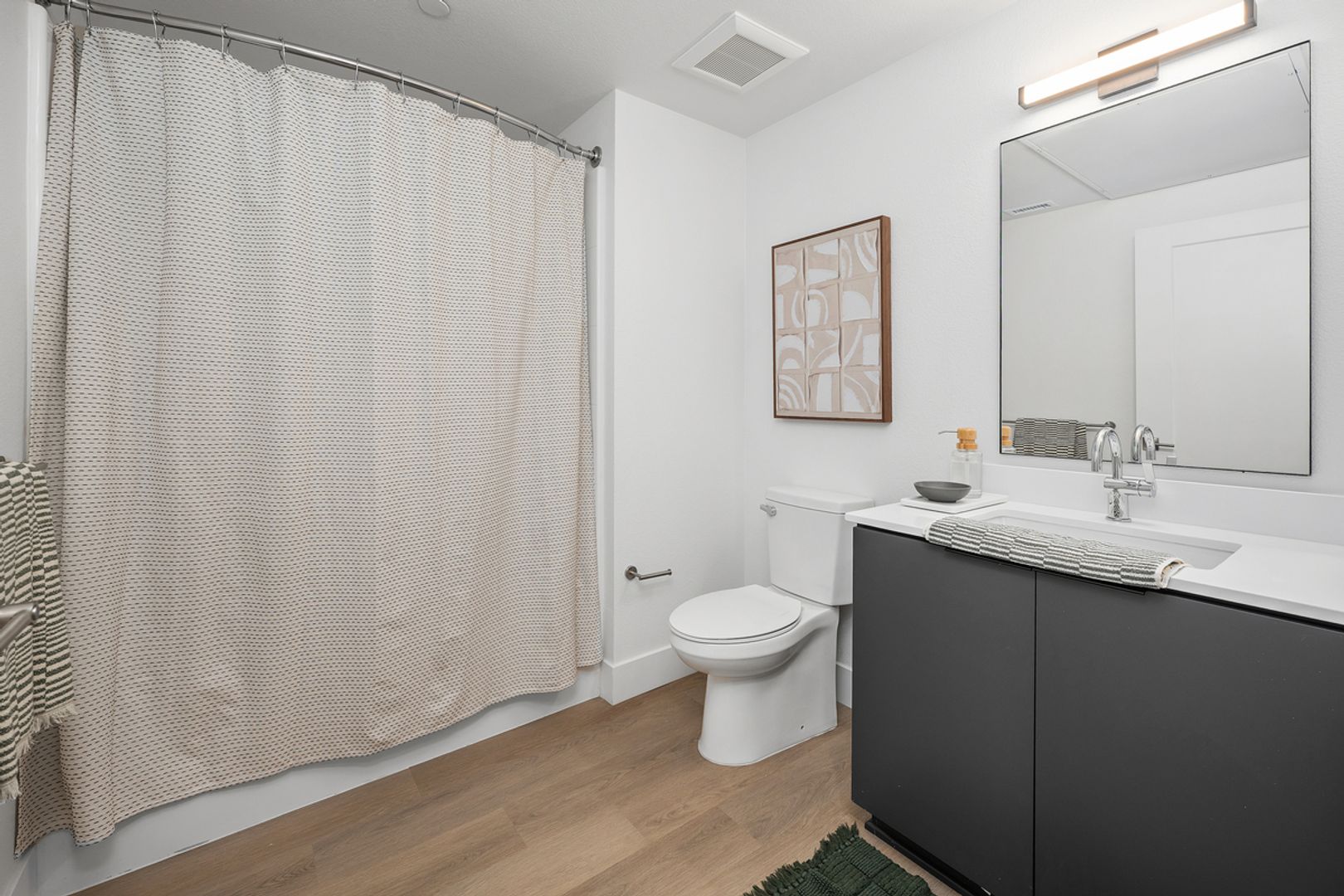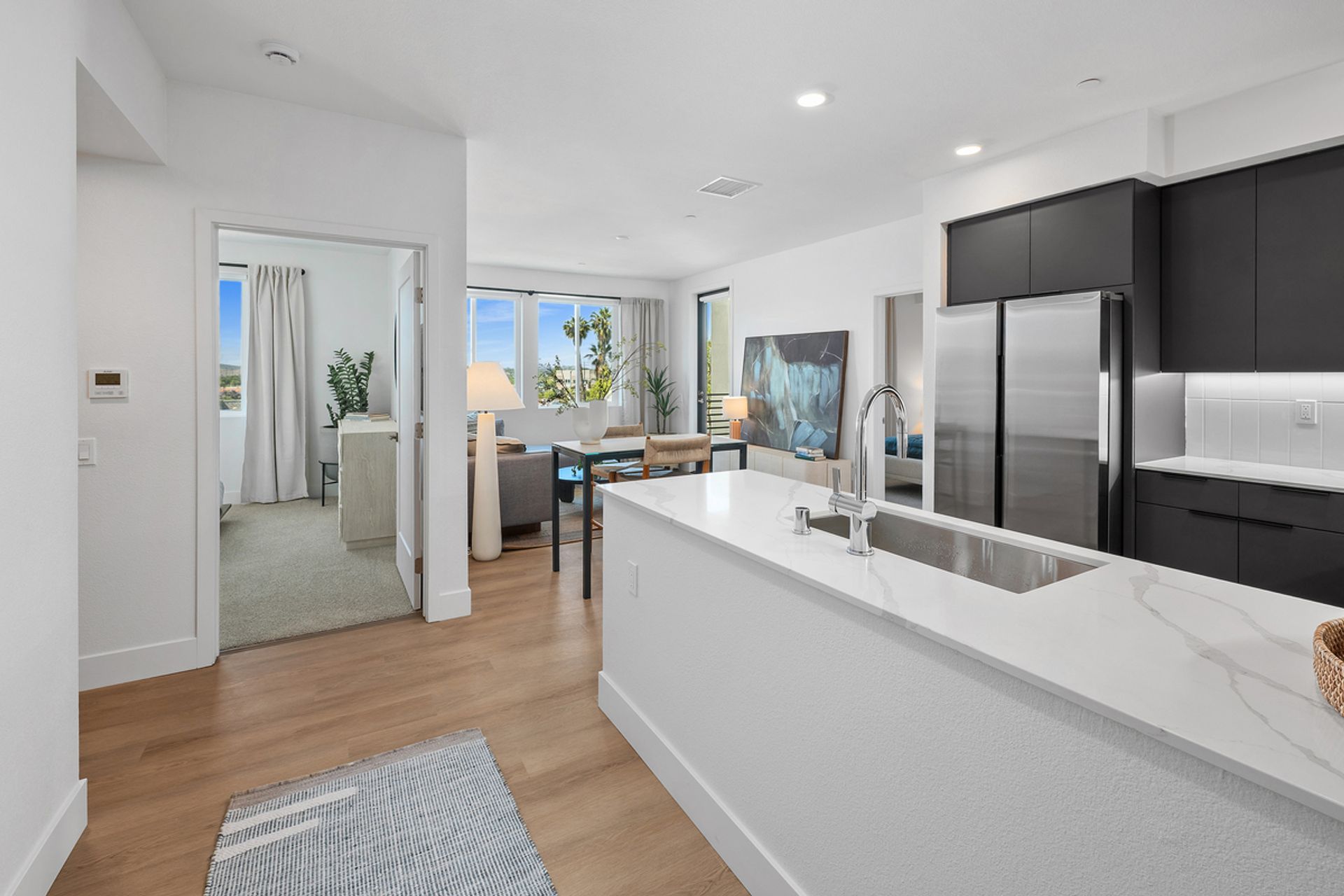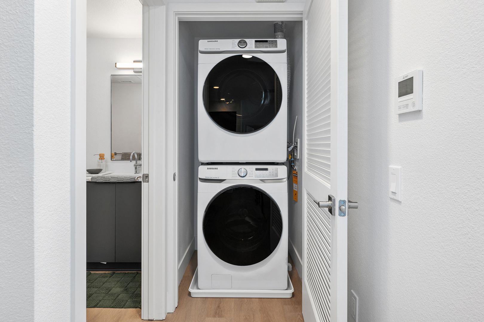 Experience comfort and style in this beautifully designed 2-bedroom, 2-bath apartment. Featuring an open-concept layout, modern kitchen with a large island and stainless steel appliances, and a bright, inviting living area that opens to a private balcony. The bedrooms are thoughtfully separated for privacy, each with its own bathroom, while the in-unit washer and dryer add ultimate convenience. Enjoy sleek wood-style flooring throughout and a warm, contemporary design that makes you feel right at home.