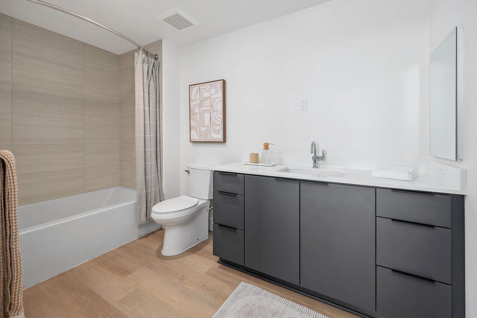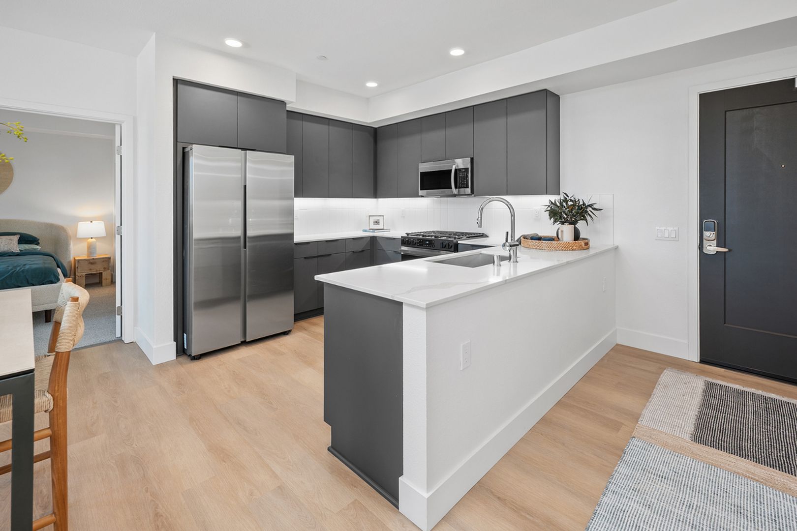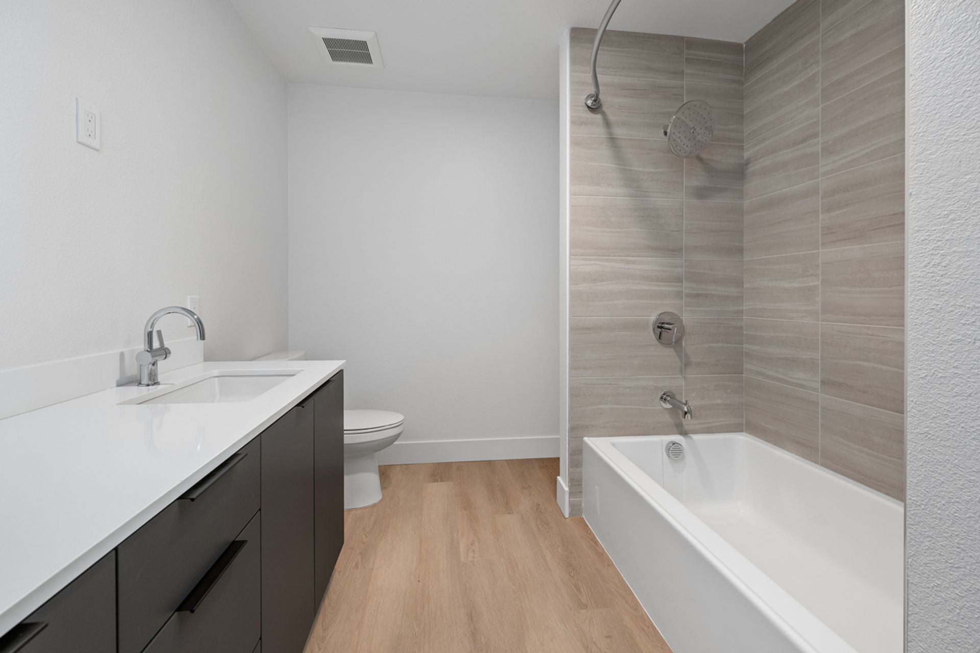 Experience comfort and style in this beautifully designed 2-bedroom, 2-bath apartment. Featuring an open-concept layout, modern kitchen with a large island and stainless steel appliances, and a bright, inviting living area that opens to a private balcony. The bedrooms are thoughtfully separated for privacy, each with its own bathroom, while the in-unit washer and dryer add ultimate convenience. Enjoy sleek wood-style flooring throughout and a warm, contemporary design that makes you feel right at home.